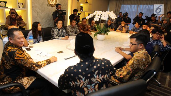 Musikus berfoto bersama seusai menemui Ketua DPR Bambang Soesatyo di Kompleks Parlemen, Senayan, Jakarta, Senin (28/1). Pertemuan membahas hasil kajian RUU Permusikan yang dilakukan bersama Koalisi Seni Indonesia dan KAMI. (Liputan6.com/Johan Tallo)