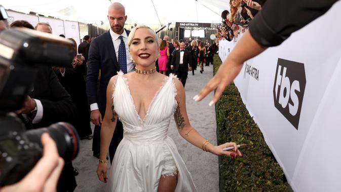 Lady Gaga berpose saat menghadiri acara 25th Screen Actors Guild Awards di Los Angeles, California, AS (28/1). Lady Gaga tampil anggun menggenakan gaun putih dengan belahan hingga paha kreasi Dior Haute Couture. (AP Photo/Jordan Strauss)