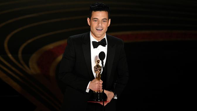 Rami Malek setelah menerima penghargaan di atas panggung perhelatan Oscar 2019 di Dolby Theatre, Los Angeles, Minggu (24/2). Rami Malek meraih piala Oscar 2019 sebagai Aktor Pemeran Utama Terbaik dalam film Bohemian Rhapsody. (VALERIE MACON / AFP)