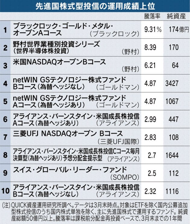 成績上位は金(ゴールド)、半導体などテーマ型が多い。ランキングの多数をアクティブ運用型が占め、ファンドマネジャーの目利き…