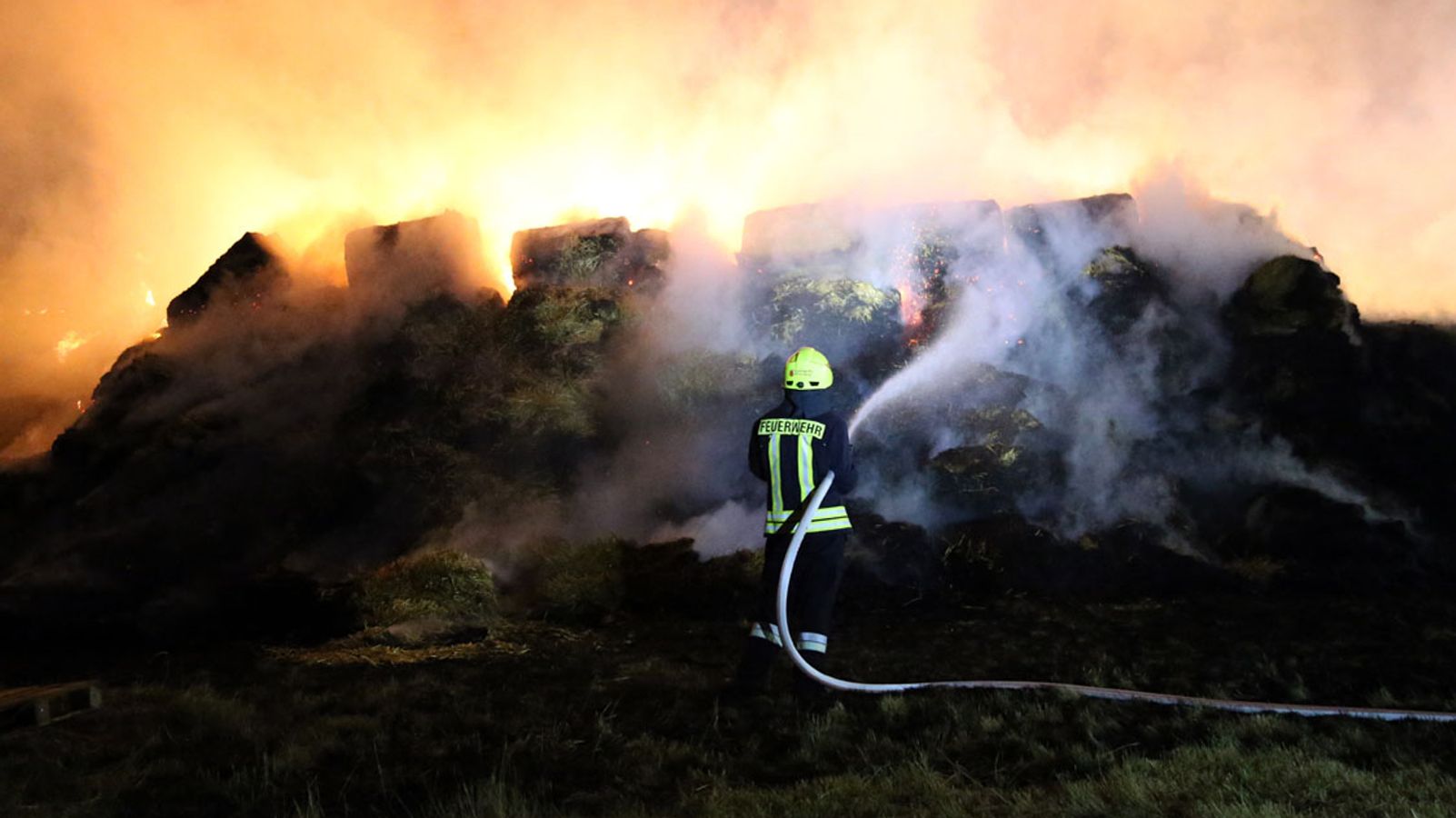 Als die Feuerwehr am Einsatzort eintraf, brannten die Heu- und Strohballen bereits lichterloh. In der Nacht ist in Miltenberg nahe der B469 ein Lager mit Rundballen in Brand geraten.