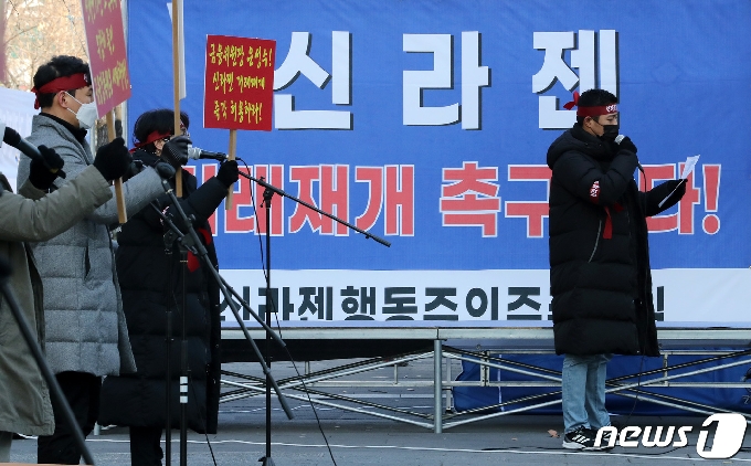 (서울=뉴스1) 이동해 기자 = 신라젠의 상폐 여부가 결정되는 30일 오후 서울 영등포구 한국거래소 앞에서 신라젠 행동주의 주주모임 회원들이 거래재개 등을 촉구하며 구호를 외치고 있다. 2020.11.30/뉴스1