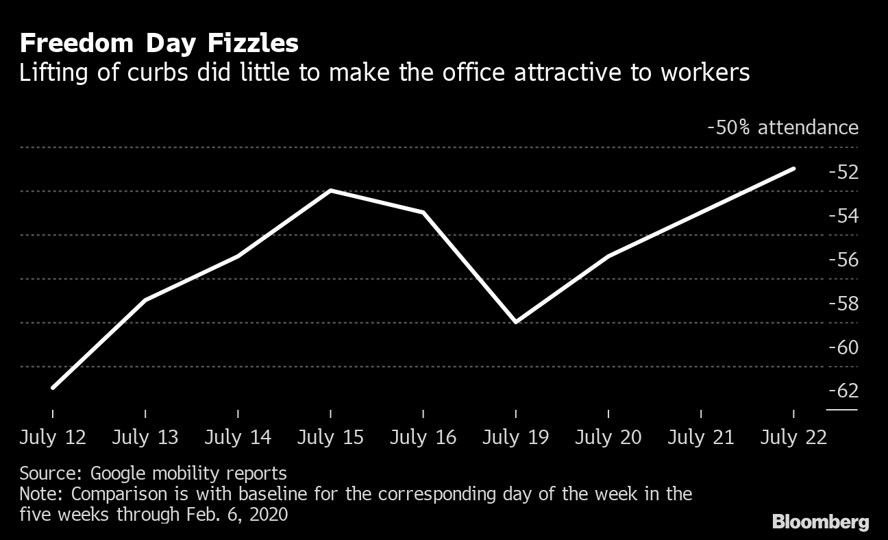 米グーグルがまとめたデータによると、22日時点でオフィスに復帰した従業員は半分弱。前週と比べてもわずかな増加にとどまった。雇用者側が期待していたような多くの従業員がオフィスに復帰するシナリオはまだ実現していない。