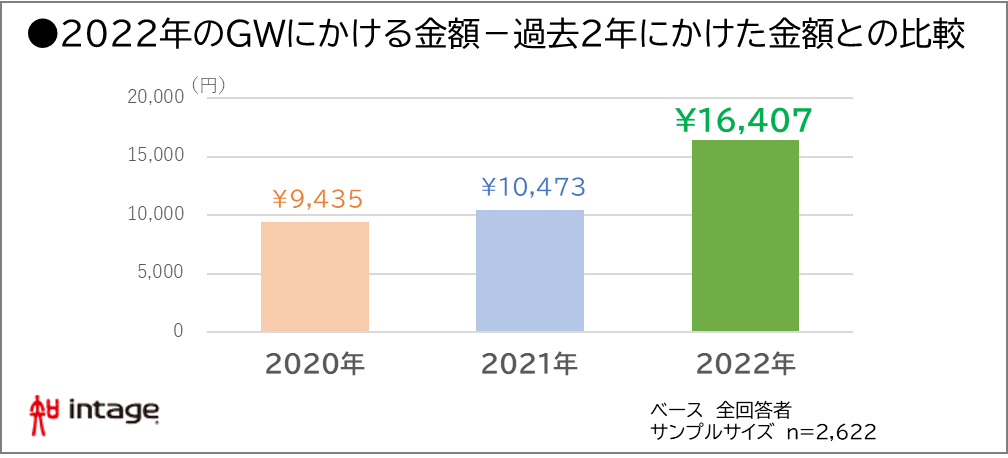 今年のGWにはどのくらいの予算を準備しているかを聞いたところ、平均金額は16,407円となりました。緊急事態宣言下だった昨年のおおよその支出金額は10,473円と回答していることから、約6,000円の増加、前年比では156.7%の増加となっており、昨年、一昨年よりも今年は「アクティブに過ごしたい」、という想いを反映した結果となっています。