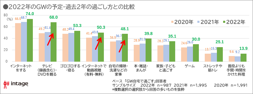「自宅の掃除・洗濯などの家事」や「普段よりも手間・時間をかけた料理」なども、昨年、一昨年よりも回答率が増しており、普段は忙しくて十分にできていなかった家事や料理に時間を充てたいという想いや、長引くコロナ下、自宅をより快適にしたいキモチも浮かんできます。