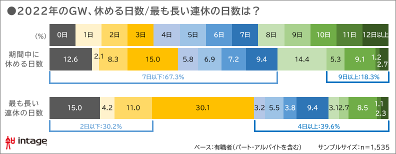GW期間中の休める日数のトータルではカレンダー通りの「8日」は14%に留まり、7割弱は「7日以下」となっています。休日にも仕事の予定がある人が多いようです。一方で「9日以上」と回答した人は2割弱でした。