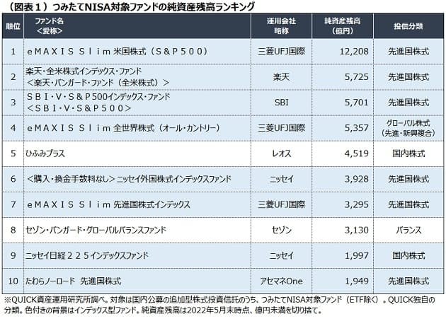 図表1はつみたてNISA対象ファンド(ETF除く)の純資産残高トップ10をランキングしたものだ。米国株式のパフォーマンスの高さなどから先進国株式型のインデックスファンドに人気が集まり、残高が膨らんでいる。上位10本中8本がインデックス型で、そのうち6本が先進国株式型だった。国内株式型はわずか2本で、うち1本は日経平均株価に連動するインデックス型だった。