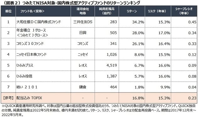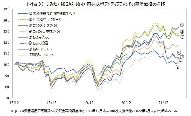国内株式型に投資するにはどのような選択肢があるのか、アクティブファンドに焦点を当てて運用成績などを調べた。図表2は主に国内株式で運用するつみたてNISA対象のアクティブファンド7本について、制度導入当初(17年12月末基準)から22年5月末までのリターンが大きい順にランキングしたものだ。また、図表3には各ファンドの基準価格の推移を載せた。それぞれ参考指標として配当込みTOPIXを併記している。
