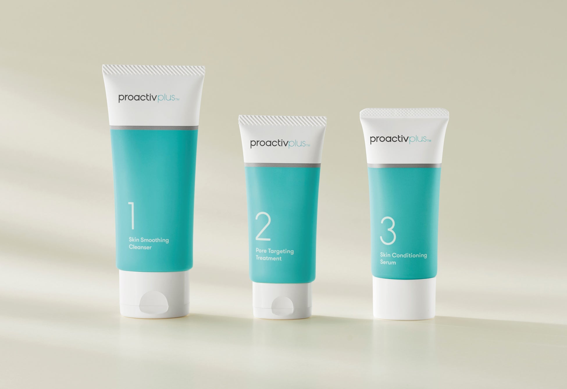 <写真左から> プロアクティブ プラス スキン スムージング クレンザー(薬用洗顔料)60g、プロアクティブ プラス ポアターゲティング トリートメント (薬用美容液) 30g、 プロアクティブ プラス スキンコンディショニング セラム (薬用ジェル状クリーム) 30g