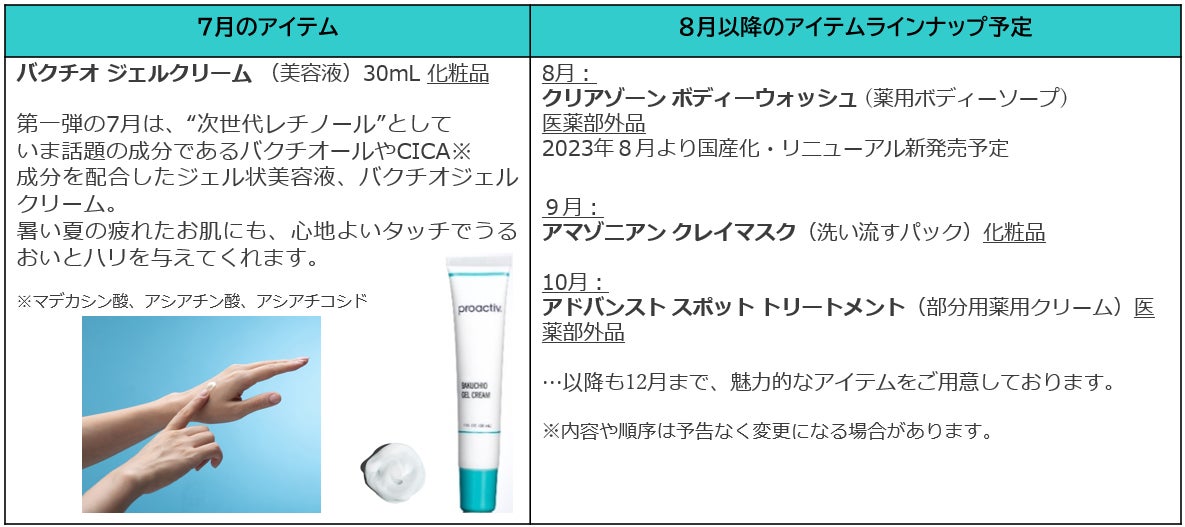 第一弾の7月は、“次世代レチノール”としていま話題の成分であるバクチオールやCICA(ツボクサエキス)※成分を配合したジェル状美容液、バクチオジェルクリームがIN。暑い夏の疲れたお肌にも、心地よいタッチでうるおいとハリを与えてくれます。 ※マデカシン酸、アシアチン酸、アシアチコシド