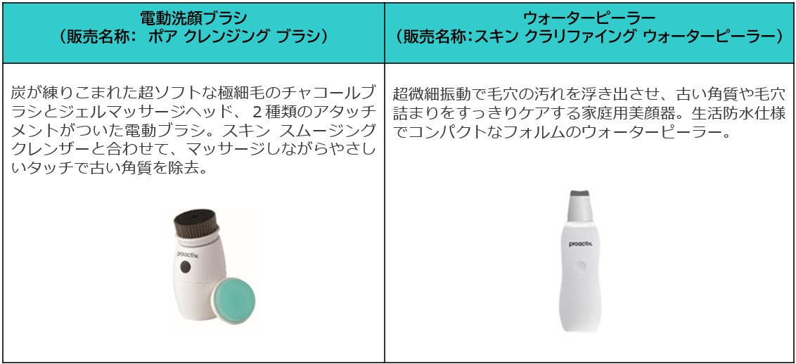 <写真左から> プロアクティブ プラス スキン スムージング クレンザー(薬用洗顔料)60g、プロアクティブ プラス ポアターゲティング トリートメント (薬用美容液) 30g、 プロアクティブ プラス スキンコンディショニング セラム (薬用ジェル状クリーム) 30g、バクチオ ジェルクリーム(美容液)30mL, 電動洗顔ブラシ