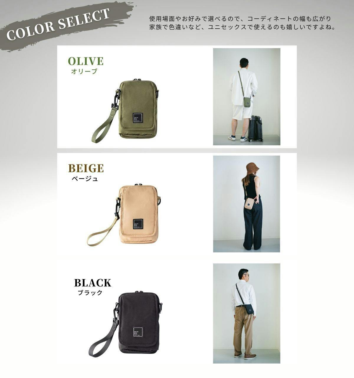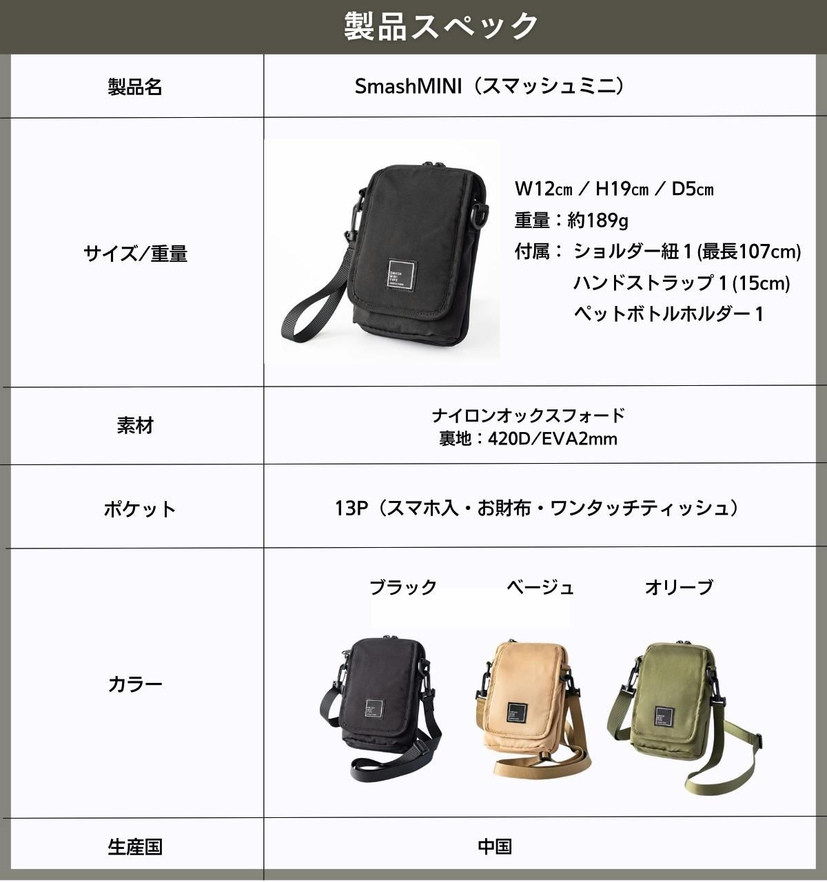 SmashMINIはブラック/オリーブ/ベージュの3色展開。