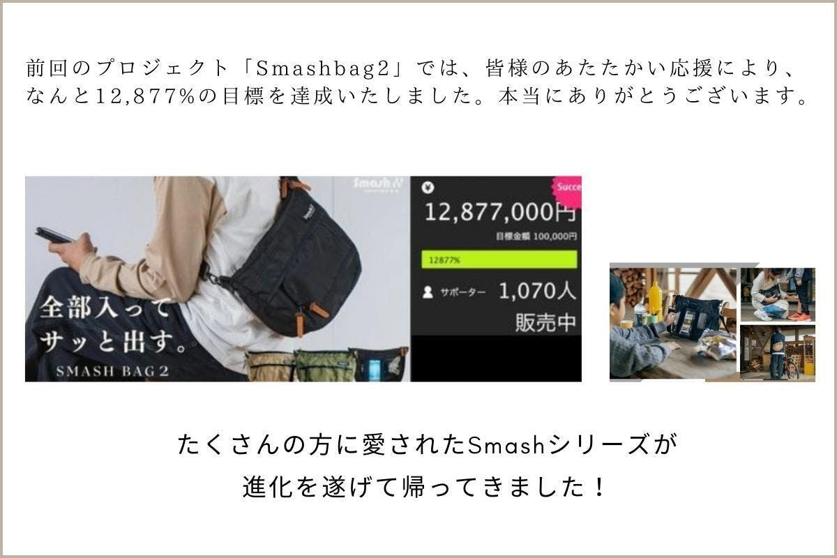 前回のSmashbag2(スマッシュバッグ)。大変多くの皆様にご支援いただき、本プロジェクトを成功することができました。ご支援いただいた全ての皆様に、心から感謝しております。